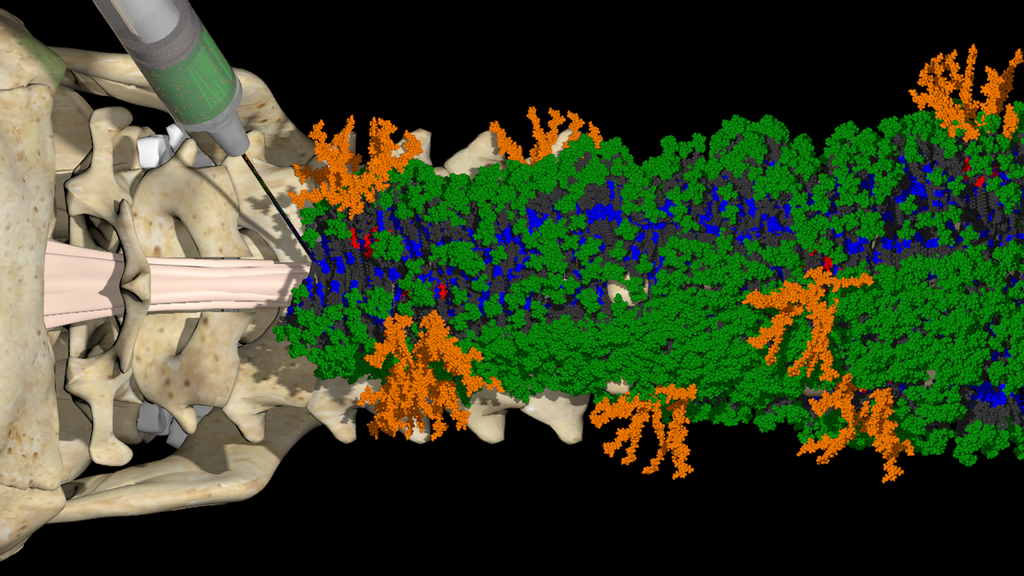 Following the injection, the moving molecules connect with receptors and initiate two signals that rejuvenate the spinal cord. One of them triggers the axons. The other improves the neurons’ chances of survival by stimulating other cell types to proliferate.