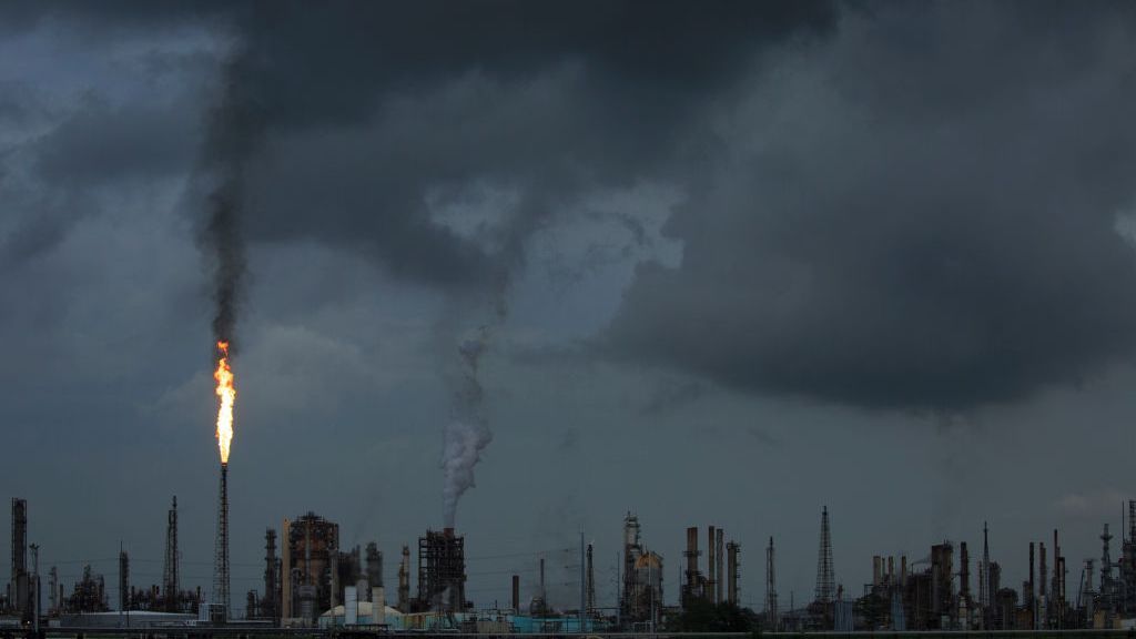 A gas flare from the Shell Chemical LP petroleum refinery illuminates the sky on August 21, 2019, in Norco, Louisiana. Located about 10 miles up the Mississippi River from New Orleans, the plant agreed to install $10 million in pollution monitoring and control equipment in 2018 to settle allegations that flares used to burn off emissions were operating in violation of the Clean Air Act. (Drew Angerer/Getty Images)