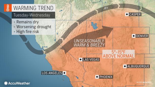 “An area of high pressure is expected to develop as the week progresses, and temperatures are likely to build across the Southwest,” said Courney Travis, AccuWeather senior meteorologist. This will result in widespread warmth and little to no precipitation across the region.