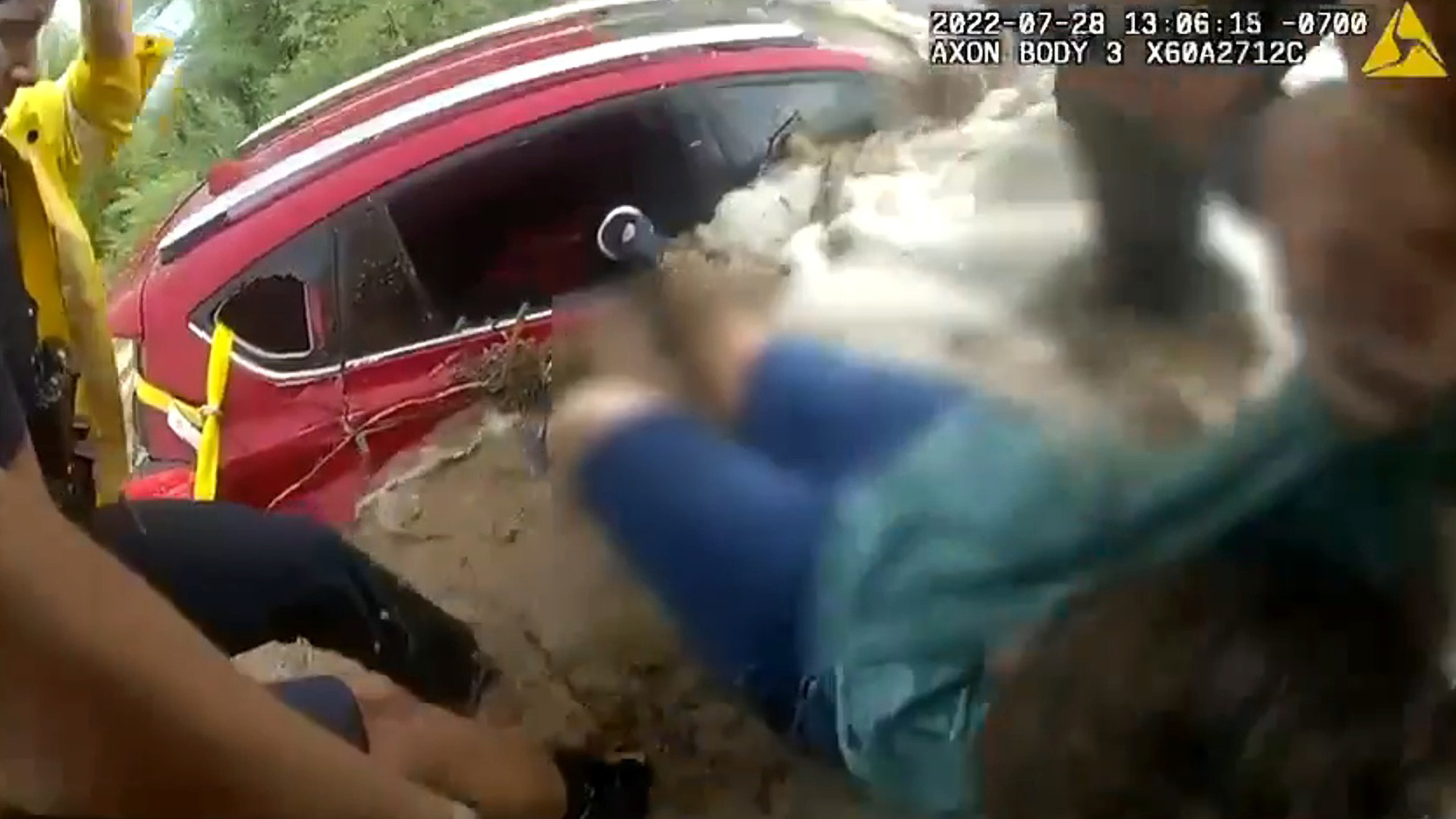 The woman can then be seen struggling to make her way through the rear right window toward the rescuers.