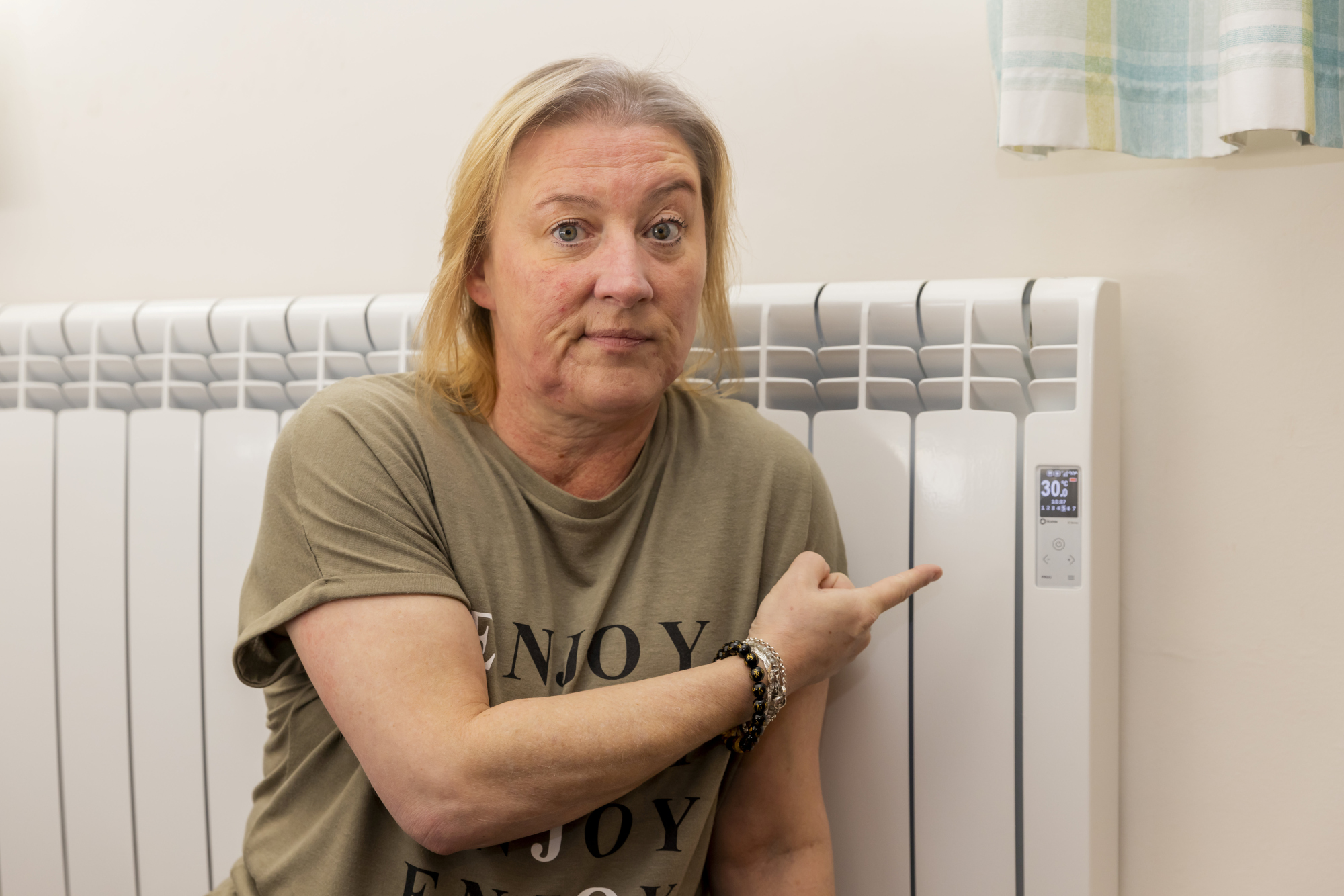 Sam Newland, 50, shows that each radiator in the house is set to 30 degrees on February 25, 2022. Newland is allergic to both cold and hot temperatures and has to have her heating on a constant 30 degrees in winter. (Leila Coker, SWNS/Zenger)