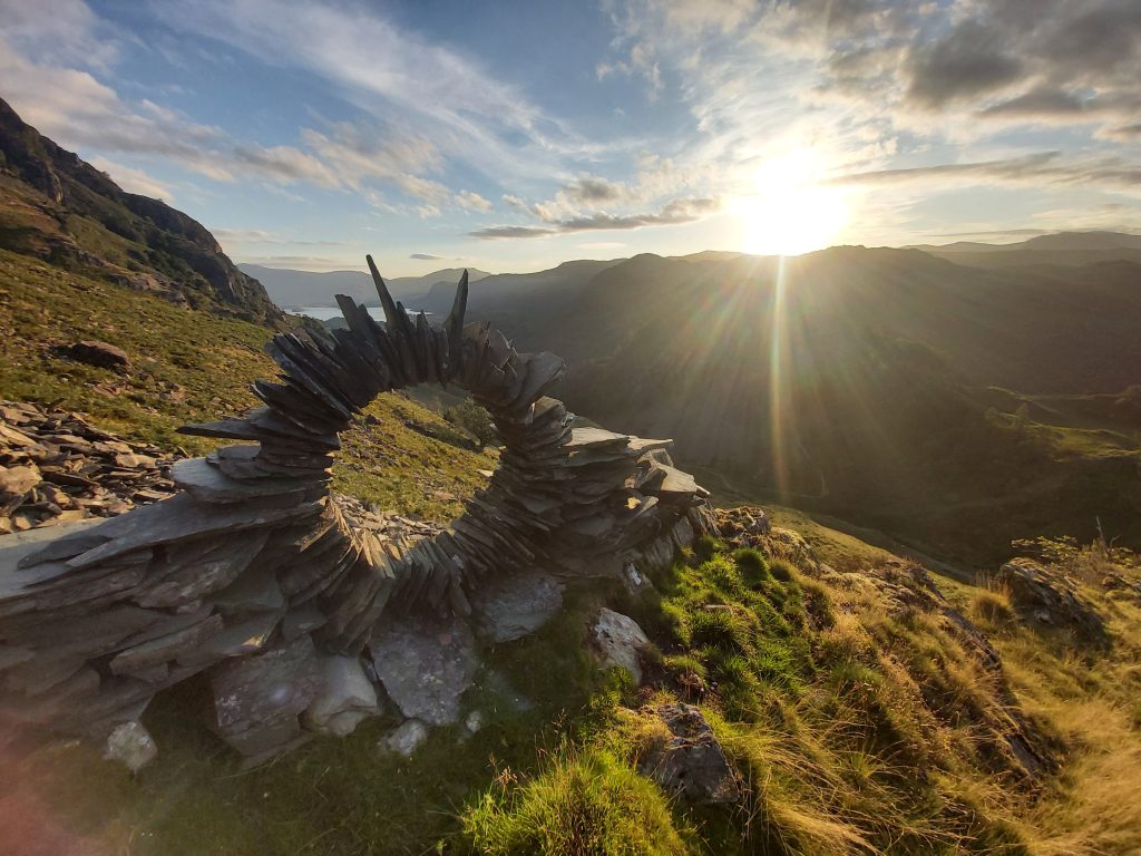 The incognito sculptor’s 2ft (60cm) semi-circular arch, propped up against a jagged rock, has been hidden near the top of a fell in the Lake District.