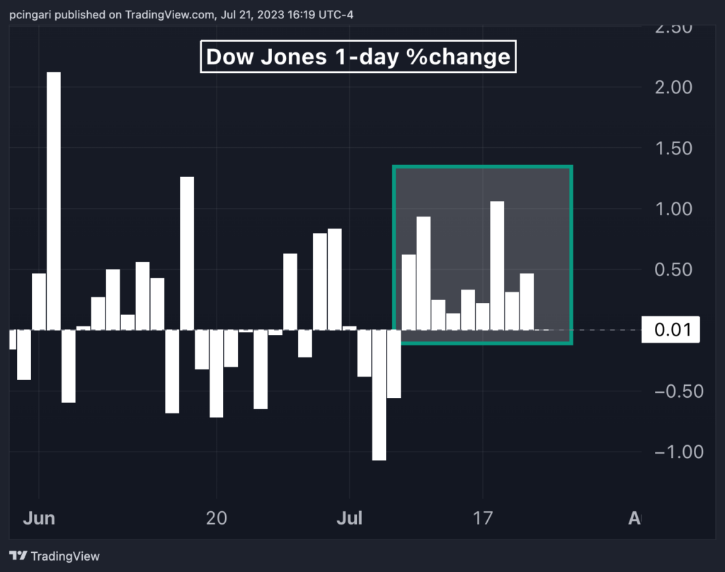 The Dow Jones Industrial Average (DJIA) recorded its tenth consecutive positive session Friday, marking the index’s longest winning streak since August 2017.