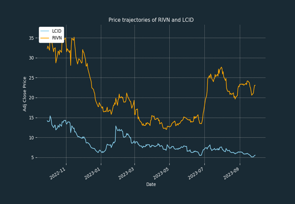 Linear regression analysis, which gives the correlation between two variables — in this case, the stock performances of Rivan and Lucid, throws up a coefficient of determination of 0.792. The number suggests a fairly tight correlation between the stocks.