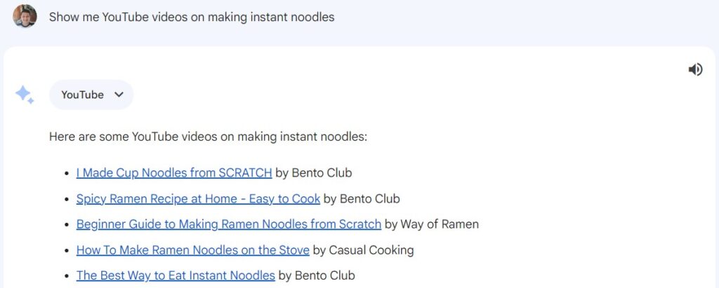 Now, simply ask Bard your question. For example, I asked, “Show me YouTube videos on making instant noodles.”