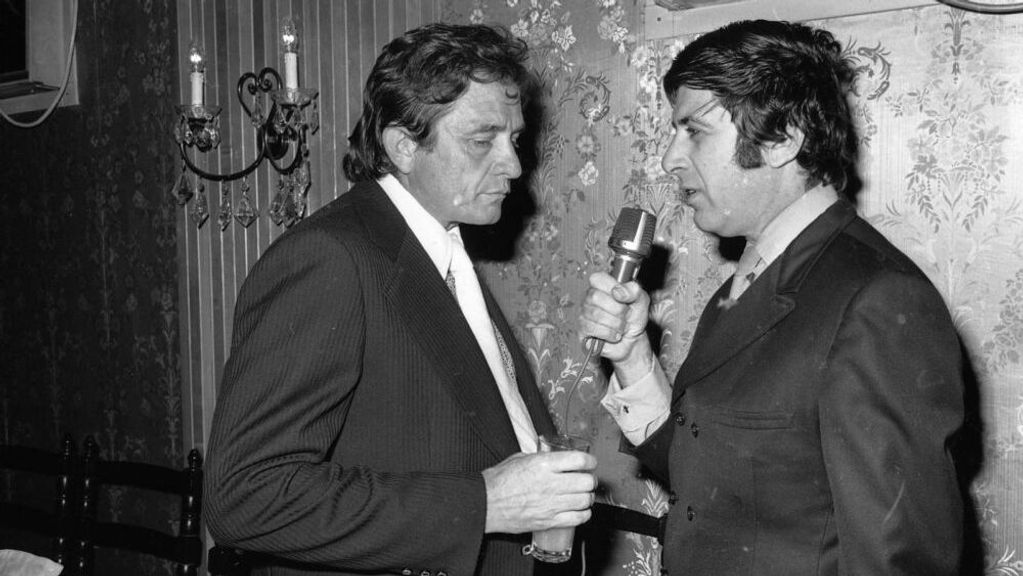 Johnny Cash, left, being interviewed for Israeli radio in Jerusalem in 1971. (IPPA staff from the Dan Hadani Archive, Pritzker Family National Photography Collection at the National Library of Israel, Jerusalem)
