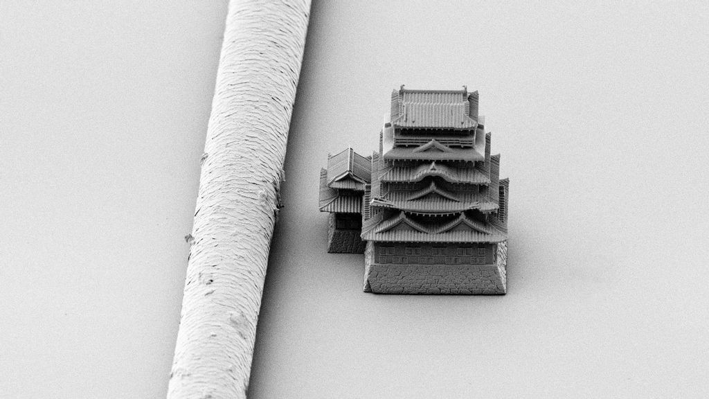 This incredible model of a Japanese castle is so small it is about the thickness of a human hair, as can be seen in this image.