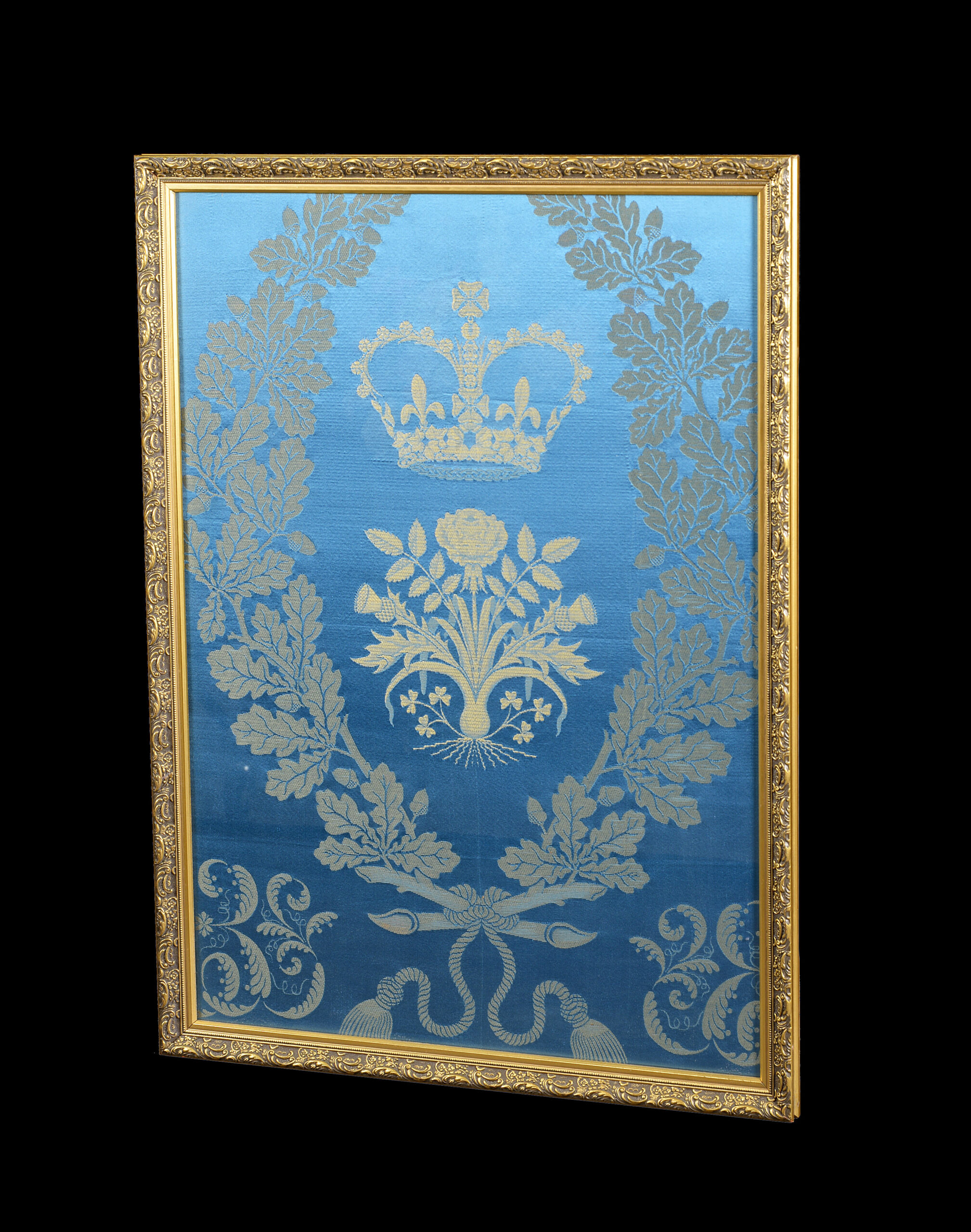 Woven in the ‘Queensway’ pattern in blue, with gold lurex thread, it features a gold woven crown above a rose, a thistle, a leek and a shamrock emblem within an oak leaf wreath on a pale blue ground.
