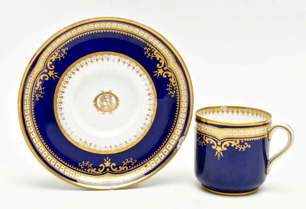 The cup and saucer, painted cobalt blue with gold gilt, were recently discovered during a house clearance in the Four Oaks area of Sutton Coldfield, West Mids, England.