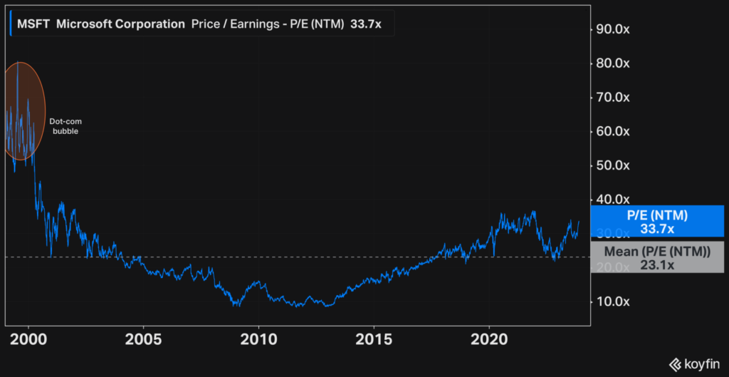 Over the past two decades, Microsoft’s forward P/E ratio typically averaged around 20x-23x. While the current valuation was undoubtedly on the expensive side, it had not yet reached bubble territory. During the dot-com bubble of the late 1990s, Microsoft’s price-to-earnings ratio exceeded a staggering 80x.