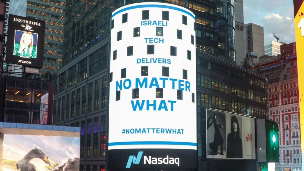 A picture of the NASDAQ towers. A new international campaign touts business continuity and the resilience of Israel's tech sector. SNC.